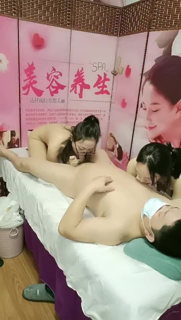 美容养生会馆享受的大哥勾搭黑丝女技师玩起了双飞,一个给舔乳头一个给舔鸡巴好刺激